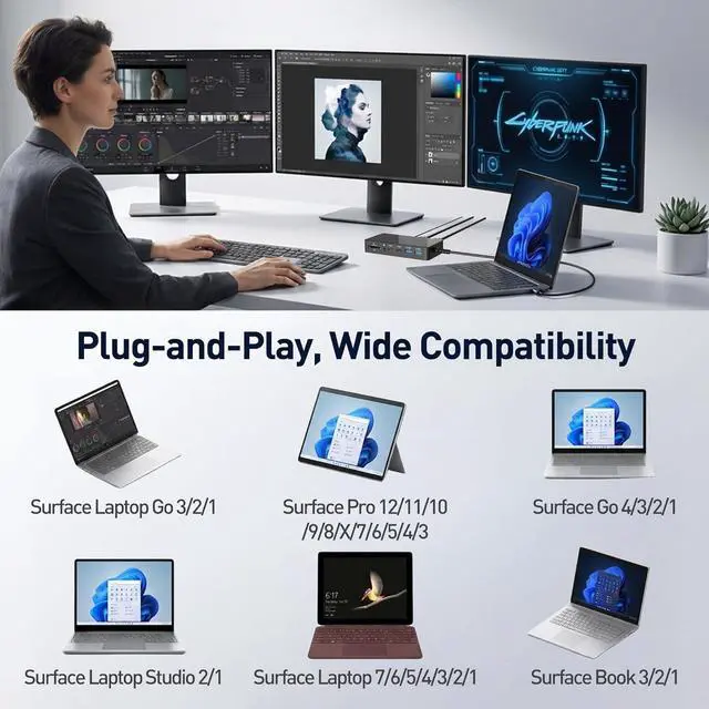 Broad Surface CompatibilityDesigned with Thunderbolt 4 interface, this Microsoft Surface docking station works seamlessly with a wide range of devices, including Surface Pro 12/11/10/9/8/X/7+/7, Surface Laptop 7/6/5/4/3, Surface Book 3, Surface Go 4/3/2, Surface Laptop Go 3/2/1, and Surface Laptop Studio 2/1.