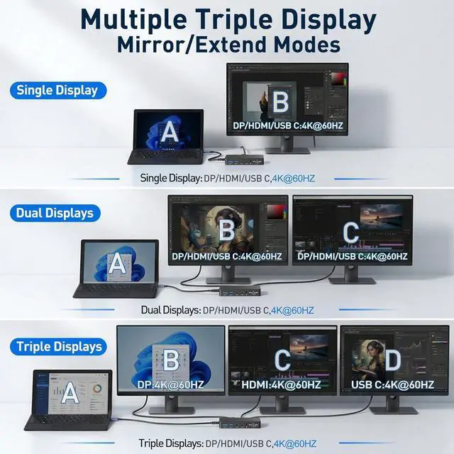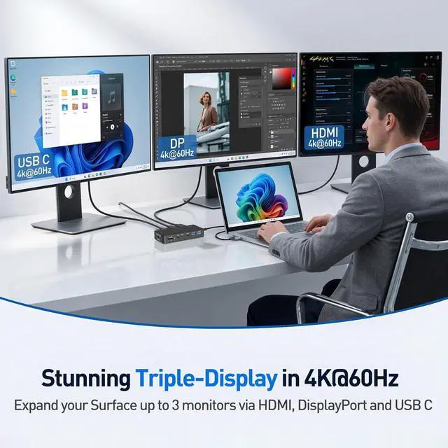 Triple 4K@60Hz Displays: Ultimate Visual ExperienceHarness the full power of Thunderbolt 4 to connect three external monitors simultaneously via HDMI, DisplayPort, and USB-Call at stunning 4K@60Hz. Whether you're setting up a multi-tasking office workstation or an immersive creative studio, this Surface Pro dock delivers buttery-smooth visuals without compromise.