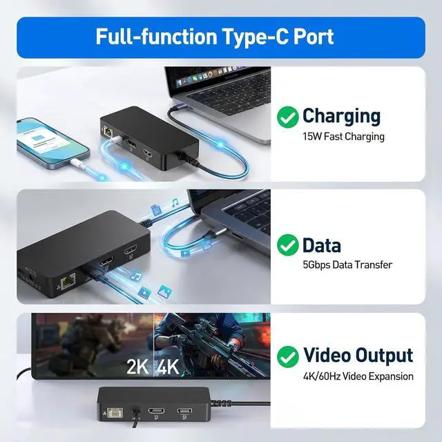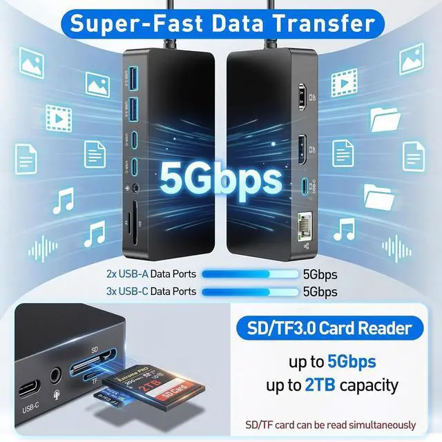 High-Speed Data & SD/TF Card AccessTransfer files in seconds with dual USB-A 3.0 and dual USB-C ports, all supporting speeds up to 5Gbps. Perfect for USB drives, external hard disks, and peripherals. The built-in SD and TF card slots support transfer speeds up to 104MB/s, making it easy to import photos and footage directly to your Surface laptop.