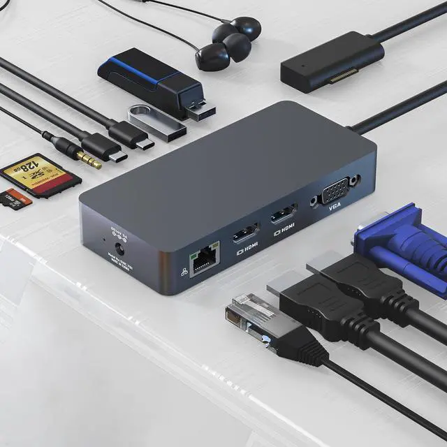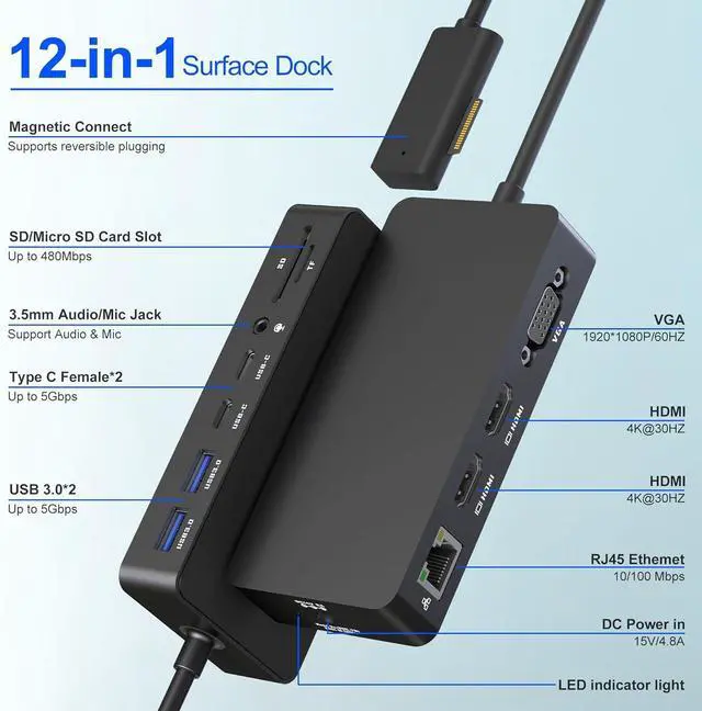 12-in-1 Multi-Functional Surface Dock: Equipped with Surface Connect technology, this Surface docking station expands your workflow withdual 4K HDMI + Full HD VGA for multi-screen productivity, High-speed 2*USB-C/2*USB 3.0 ports (5Gbps) for instant file transfers, built-in 100Mbps RJ45 Ethernet port for reliable wired connections, SD/TF card slots and 3.5mm audio jacks. Seamlessly connects to Surface devices via magnetic Surface Connect port with plug-and-play functionality, while featuring dedicated DC power input for simultaneous charging.