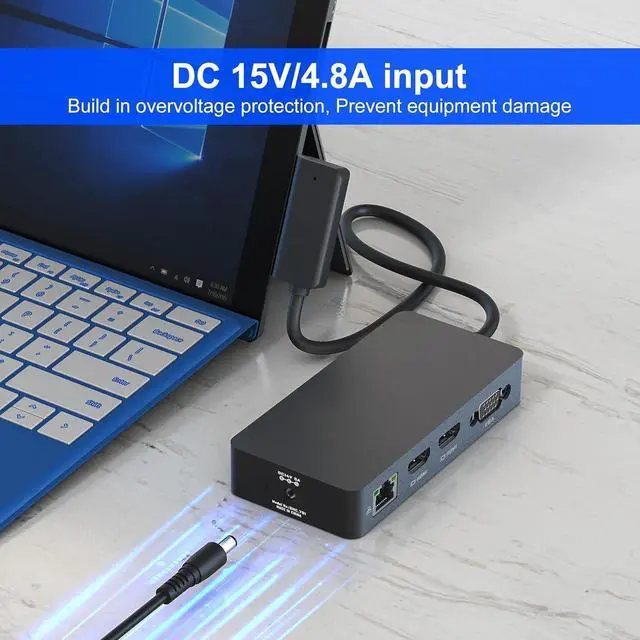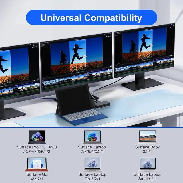 Broad Surface Device Compatibility: This Surface Pro docking station featuring Surface Connect technology, is widely compatible with Surface devices including Surface Pro 11/10/9/8/X/7+/7/6/5/4/2017, Surface Laptop 7/6/5/4/3/2/1, Surface Go 4/3/2/1, Surface Laptop Go 3/2/1, Surface Laptop Studio 2/1, and Surface Book 3/2/1. (Ensure the power supply is connected to the dedicated DC input port when using the Surface dock for stable charging performance)