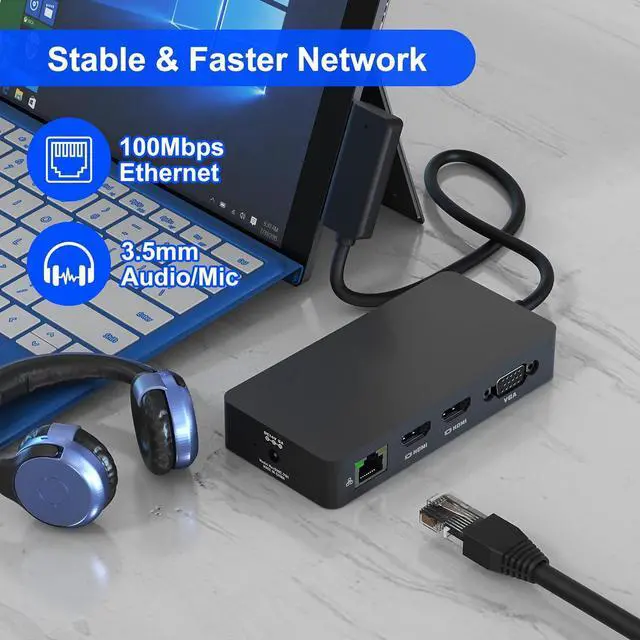 Surface Dock Hub with 3.5mm Audio & Ethernet: Our Surface Dock streamline your workspace with a dedicated 3.5mm audio port for wired headphones and Fast Ethernet (10/100 Mbps) connectivity through the RJ45 port, delivering stable network performance for video calls, large file transfers, and latency-sensitive tasks.