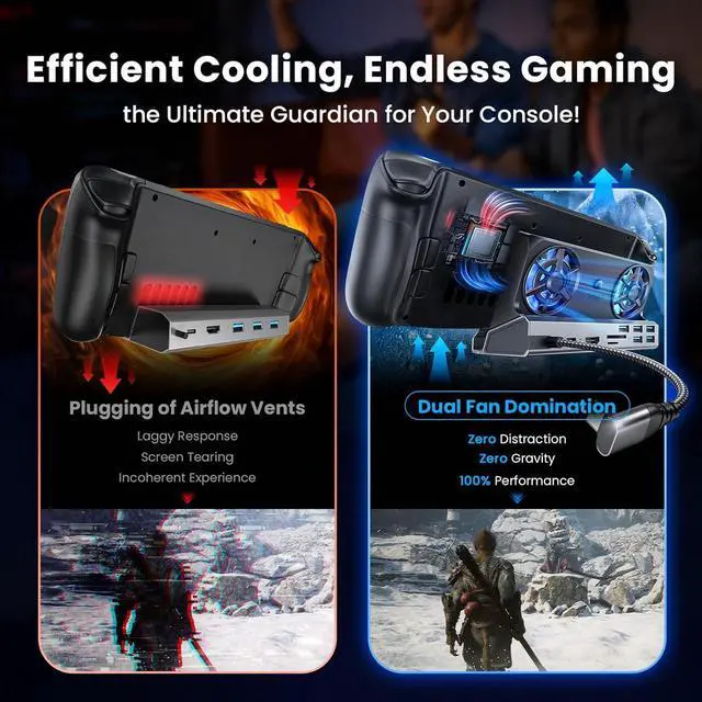 Dual Cooling RGB Fans: Good heat dissipation not only extends the battery life of the steam deck, but also prevents other problems caused by overheat,increase the speed of cooling air entering steam deck so that heat dissipates faster.Say goodbye to the woes of system crashes or lost frames, and embrace a consistently smooth gaming experience.