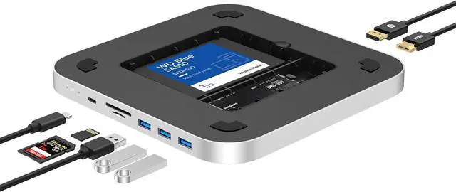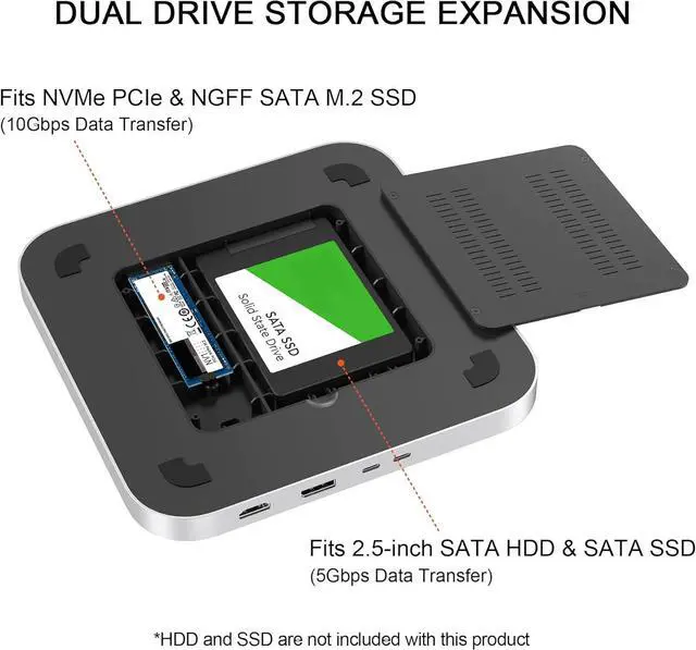 What You Get: It includes UH25 Max, quick start guide for users, self-adhesive sponges to ensure an optimal fit for SATA SSD/HDD installation, screws and screw driver, USB-C to USB-C cable for connecting to your Mac and USB-C to USB-A cable for connecting to external power supply. Note that this item does not include any HDD or SSD.