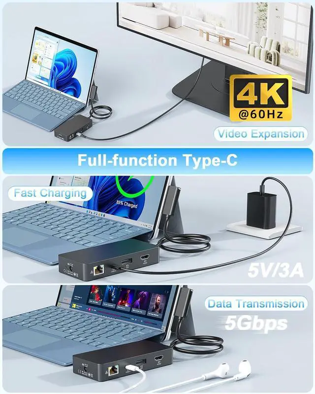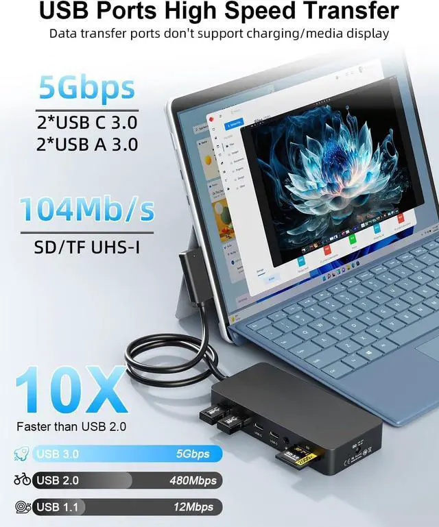 Surface Dock with Ultra-Fast Data Transfer This Surface Pro Docking Station features a full-function USB-C port (4K@60Hz video + 5V/3A charge + 5Gbps data). With 2×USB-C and 2×USB 3.0 ports, transfer speeds reach up to 5Gbps, moving files in seconds. The TF/SD 3.0 card reader supports up to 480Mbps. This Surface Docking Station is ideal for photographers, designers, and anyone needing fast access to data.
