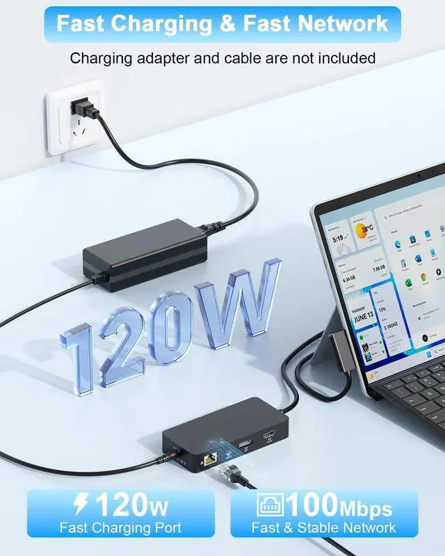 Surface Dock Hub with 120W Fast Power Supply The latest Surface Dock Hub supports 1415V/48A power delivery, replacing the original 45W charger. Charge your laptop from low to full in about 2.5 hours while powering phones and accessories simultaneously. This Surface Laptop Docking Station ensures reliable performance and improved efficiency, making it perfect for busy professionals. Please connect the included 120W adapter when in use.
