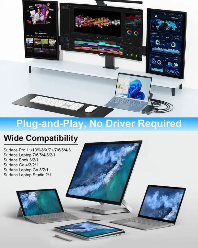 Universal Plug & Play Dock for Surface Devices With the 2026 Power Expand connector design, this Surface Docking Station ensures effortless connection without worrying about direction. Compatible with Surface Pro 12/1/10/9/8/X/7+/7/6/5/4/3, Surface Laptop7/6/5/4/3/2/1, Surface Laptop Studio 2/1, Surface Go 4/3/2/1, Surface Laptop Go 3/2/1, and Surface Book 3/2/1, this Surface Media Hub covers nearly all models, offering universal usability.