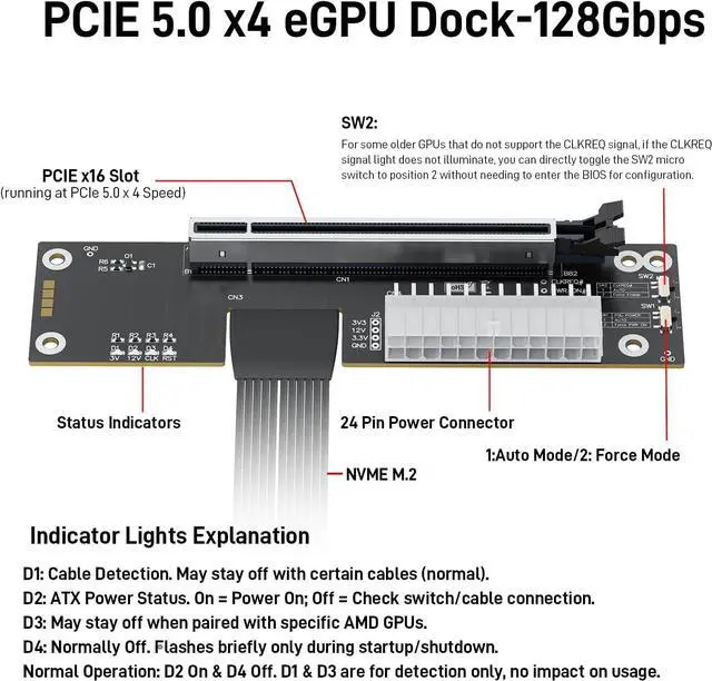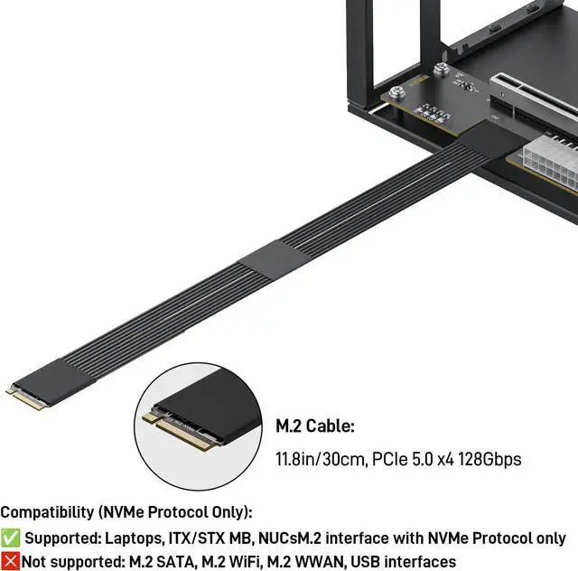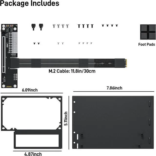 Package Include: NVME M.2 Female to PCIe x16 Enclosure Dock 30cm/11.8inch (Note: The GPU and Power Supply are not included)