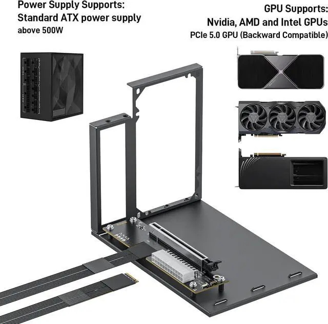 Compatible Graphics Cards and Power Supply: Supports NVIDIA RTX 50 Series, AMD RX 90xx Series, new-generation PCIe 5.0 graphics cards (backward compatible) with transfer speed up to PCIe 5.0 x4 (128Gbps), as well as full-size high-performance graphics cards, with no concerns over length restrictions Compatible Power Supplies: standard ATX power supplies ONLY (500W or higher), featuring dual screw mounting (top & bottom) for enhanced stability.