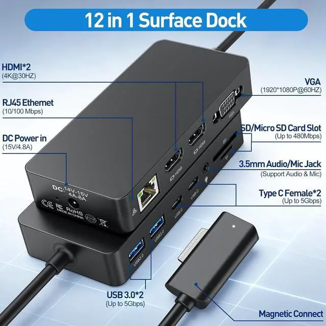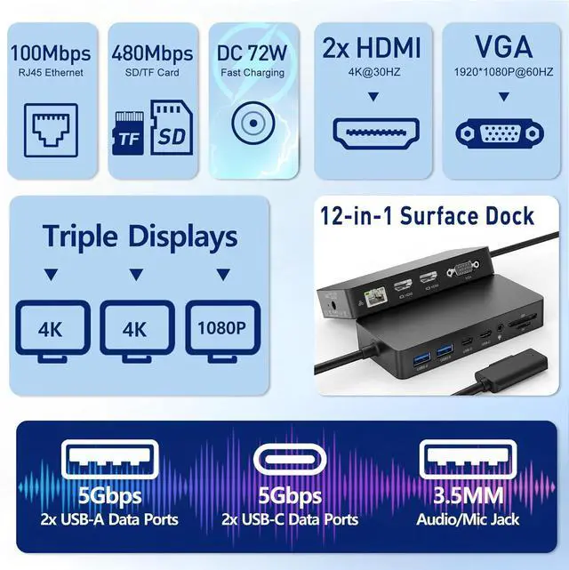 12-in-1 Surface Docking Station All-in-One Connectivity for Your Surface Pro 11 Transform your Surface into a full-fledged workstation with this 12-in-1 Surface docking station. Designed specifically for Surface devices, it features dual 4K HDMI, VGA, 2x USB-A 3.0, 2x USB-C (5Gbps), SD/TF card slots (supports up to 2TB), 100Mbps Ethernet, 3.5mm audio jack, and a 72W DC charging port. Whether you're using a Surface Pro, Surface Laptop, Surface Book, or Surface Go, this dock delivers seamless plug-and-play expansionno drivers needed.