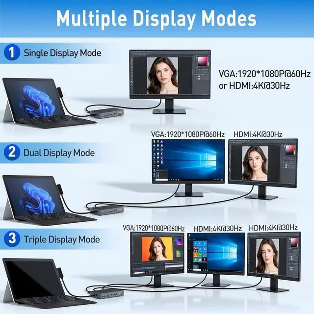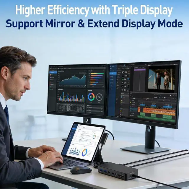 Triple Monitor Display with 4K HDMI & VGA Extend or Mirror Your Screen Maximize productivity with triple monitor support. This Surface Pro dock enables dual 4K@30Hz HDMI outputs and a 1080P VGA port, allowing you to extend or mirror your display across up to three external monitors. Ideal for multitaskers, designers, and traders using Surface Laptop Studio or Surface Pro 11, it delivers crisp visuals and smooth performance for work, streaming, or creative projects.
