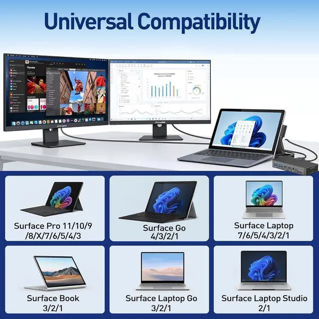 Universal Compatibility for Surface Devices Plug & Play Engineered for effortless compatibility, this Surface docking station works with a wide range of devices: Surface Pro 11/10/9/8/X/7/6/5/4/3, Surface Laptop 7/6/5/4/3/2/1, Surface Laptop Go 3/2/1, Surface Laptop Studio 2/1, Surface Book 3/2/1, and Surface Go 4/3/2/1. Just plug in and expand your workspace instantly.