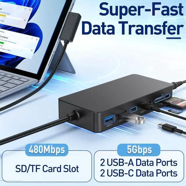 High-Speed Data Transfer & SD/TF Card Reader Instant Access Transfer files in seconds with 2x USB-A 3.0 and 2x USB-C ports, all supporting 5Gbps data transfer. The built-in SD and TF card slots offer direct access to photos and videos at up to 104MB/sideal for photographers and content creators using Surface Go or Surface Pro docks. No extra adapters, no hassle.
