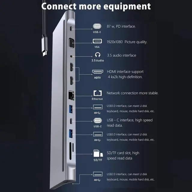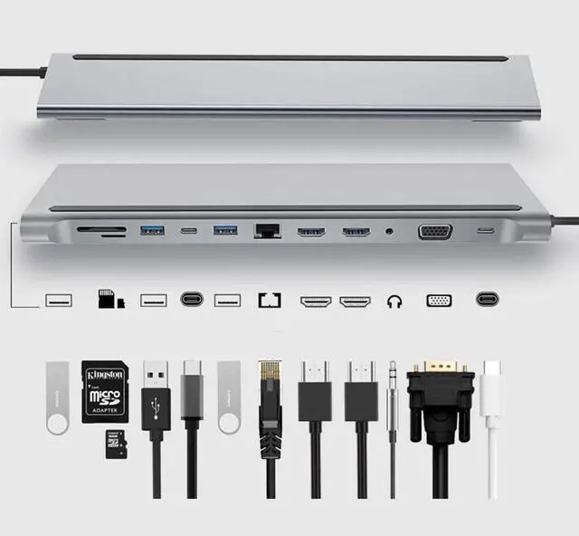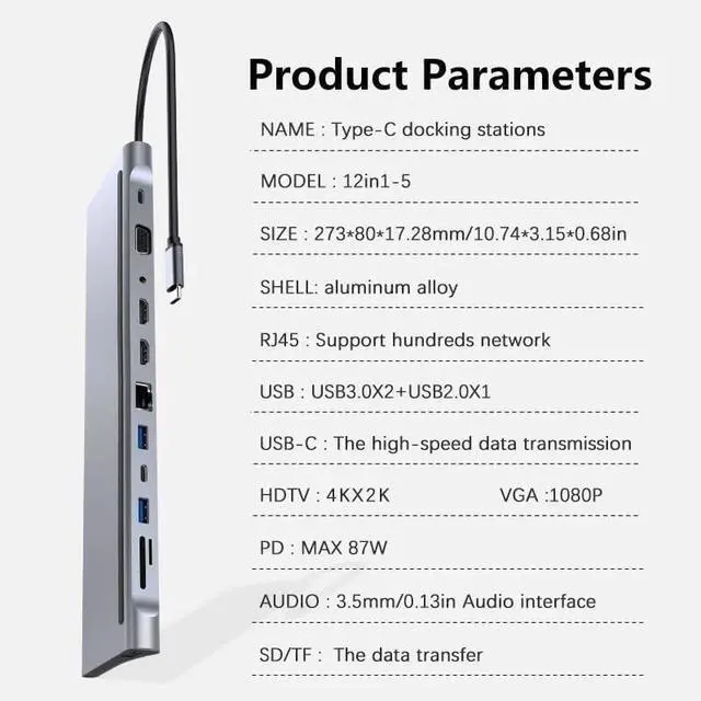 Unlock Maximum Efficiency with Our 12-in-1 USB C docking station triple monitor: Step into a world where efficiency meets versatility with our meticulously crafted 2-in-1 multi-port laptop docking station. Laptop docking station 3 monitors includes dual HDMI for up to 4K@60Hz and a VGA , 5Gbps USB-A and USB-C for high-speed data transfer, dedicated USB ports for wireless devices, a 100mbps Ethernet port for rapid internet access, SD and TF card slots. This all-in-one solution maximizes connectivity and productivity effortlessly.