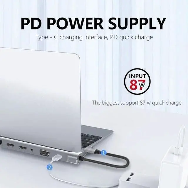 Efficient PD Charging: Charge your laptop at up to 87W via USB-C pass-through female port, simultaneously connecting multiple peripherals for data transfer.