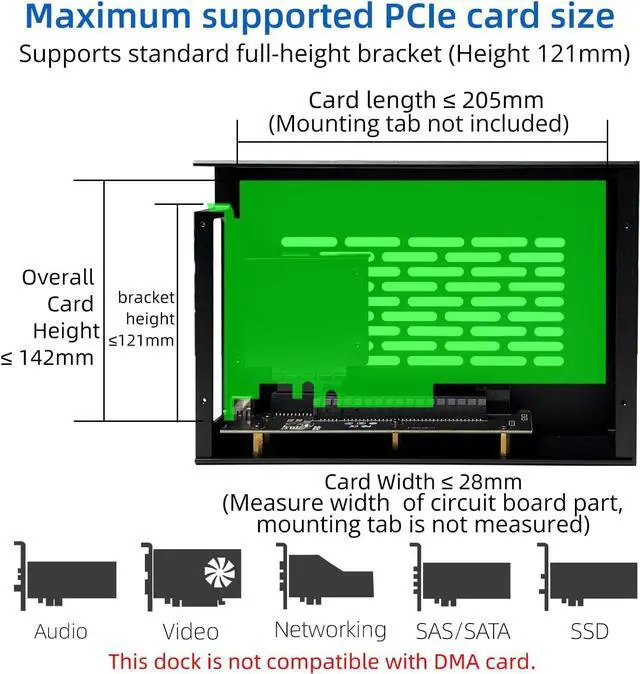Wide Compatibility: Supports cards up to 205x28x142mm, driverless plug-and-play for Windows, Linux, and macOS.
