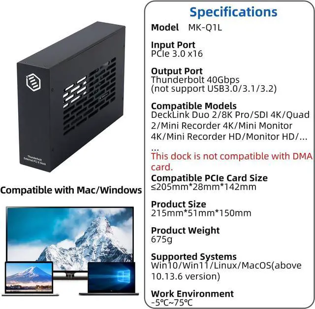 36W Power Delivery: Includes a 12V 3A adapter and slot powerideal for video capture cards, 10G network cards, and so on. Please note: This dock is not compatible with external graphics cards (eGPUs) due to their high power requirements.