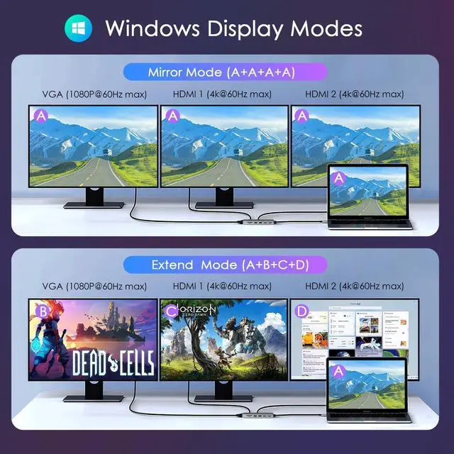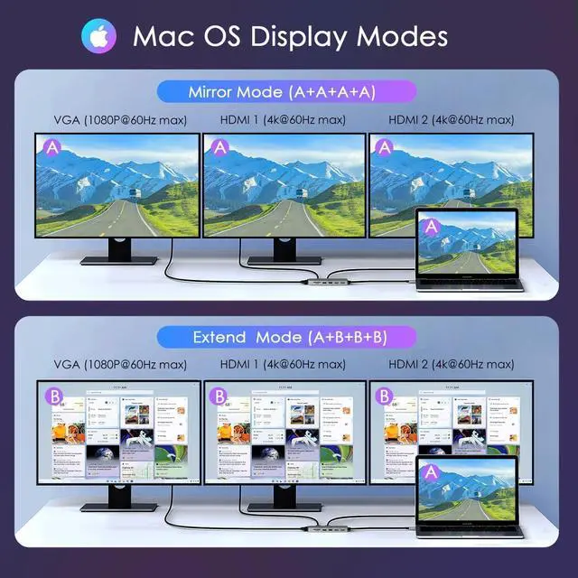 4K Dual Monitor&Triple Display: The docking Station dual monitor can easily to achieve dual-monitor and triple-monitor displays for Windows. Single use HDMI max up to 4K@60Hz,DP up to 8K@30Hz(DP1.4). When connect 2 displays, the resolution will be dual 4K@60Hz(DP1.4). Display output will be dual 4K@60Hz and 4K@30Hz when triple display(DP1.4). When connecting 4 monitors and 3 monitors are displayed, please plug in the DP port first,then plug in the 2 HDMI ports. Mac OS ONLY Support Mirror Mode.