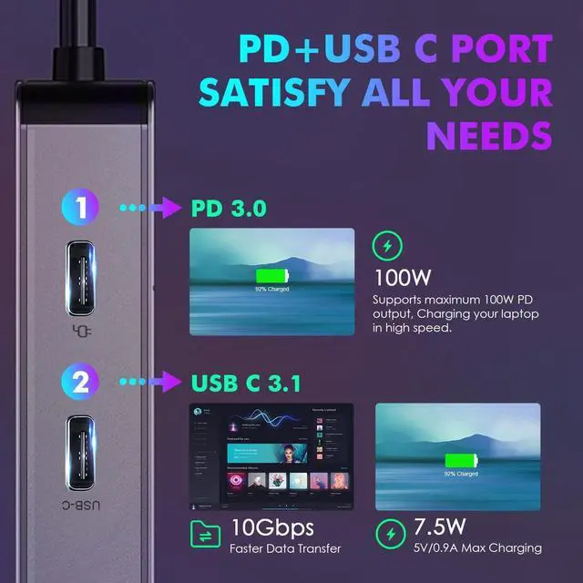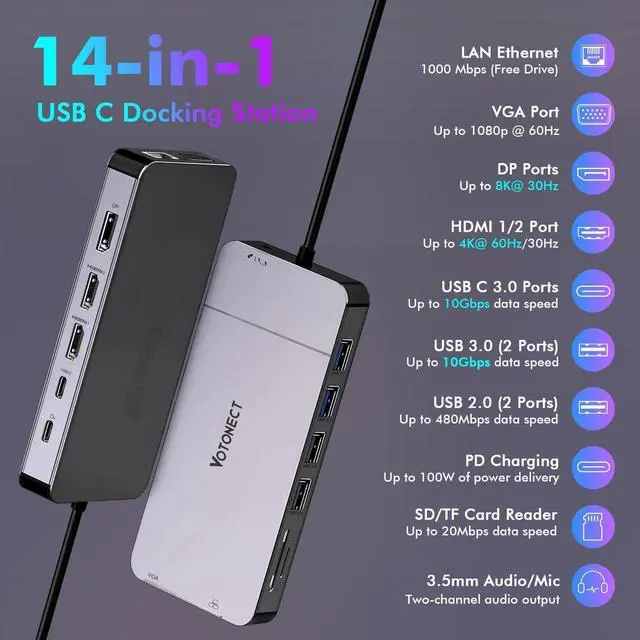 USB C Docking Station 14 IN 1: Plug and play. With this USB C hub multiple adapter you can easily extend your laptop from one type c/thunderbolt 3 port into 13 ports, you get 2*4K@60Hz HDMI, 8K@30HZ / 4K@144HZ DP, VGA, 2*USB 3.0 ports, USB C 3.0 port, 2*USB 2.0 ports, SD/TF card reader, 100W USB C PD Port, 1Gbps Gigabit Ethernet, 3.5mm Mic/audio.