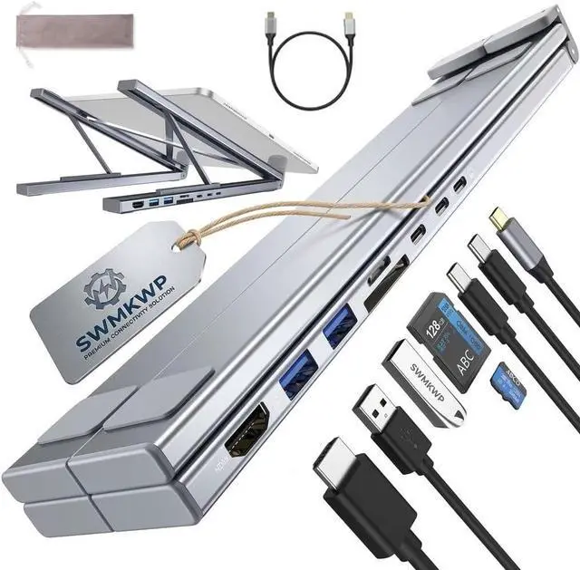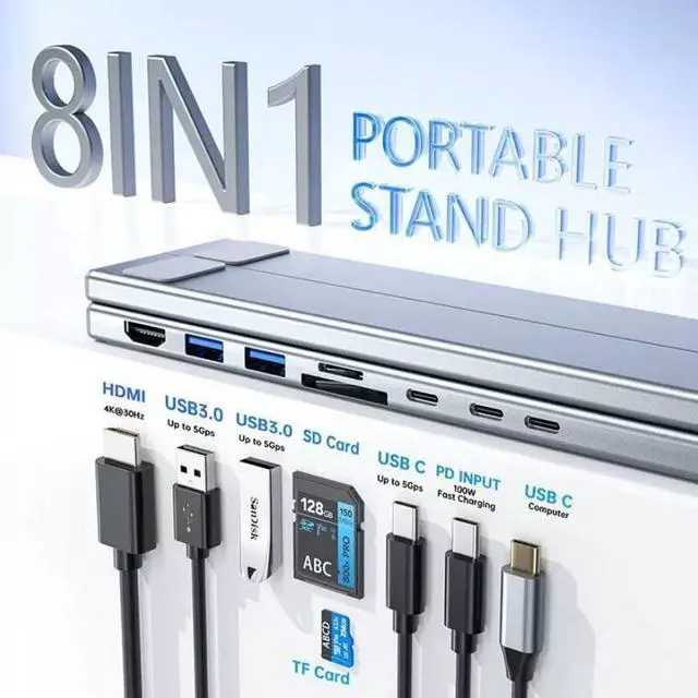 8 in 1 USB C Expansion Hub: USB-C Docking Station Laptop Stand with 4K HDMI integrates hub and stand in one compact solution supporting multiple device expansion includes HDMI USB A USB C ports for data transfer charging and workspace organization ideal for laptop stand with docking station setups