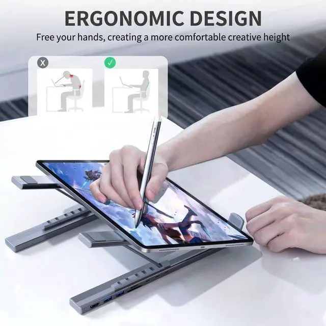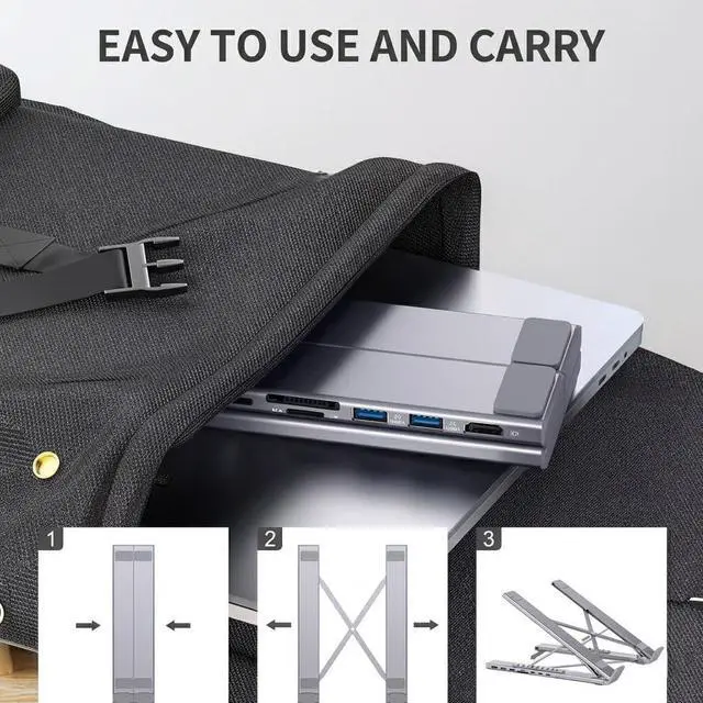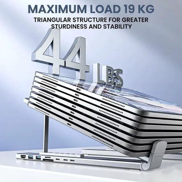 Adjustable Folding Ergonomic Design: Laptop stand with docking station features multi angle height adjustment and foldable aluminum structure improves posture reduces neck strain and supports airflow for heat dissipation compact design supports portability and storage