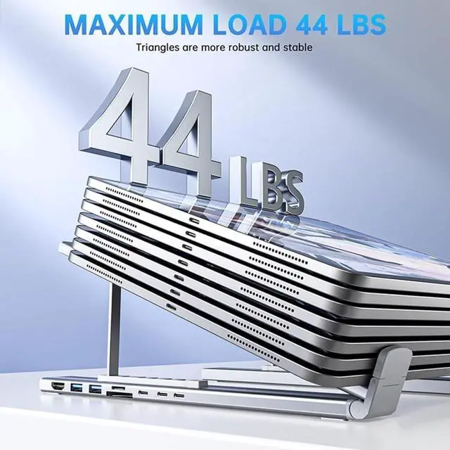 ADJUSTABLE LAPTOP STAND - Supports laptops from 10 to 17 inches with 6 height adjustments and 44lbs maxi loading, improving ergonomics by reducing neck strain. Its foldable design allows for easy storage and portability when not in use.