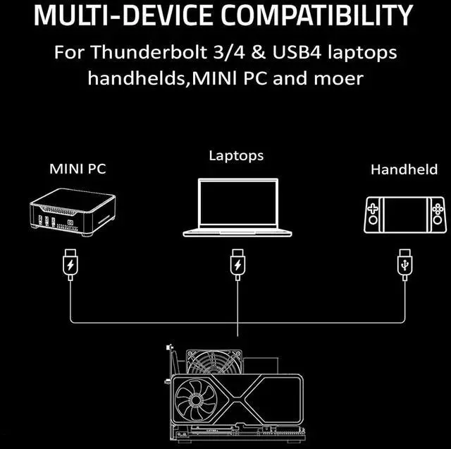 Universal Compatibility This eGPU dock works flawlessly with Thunderbolt 3/4 or USB4-equipped devices, including NUCs, laptops, and gaming rigs. Supports the latest NVIDIA (RTX 50 Series: 5090 D/5080/5070 Ti/5070) and AMD (RX 7000 Series) GPUs, delivering high-performance graphics for gaming and creative workloads