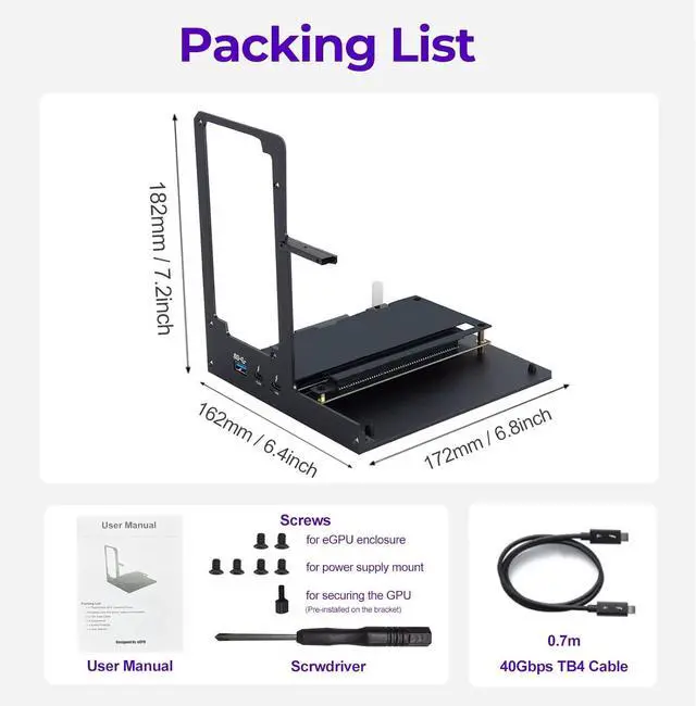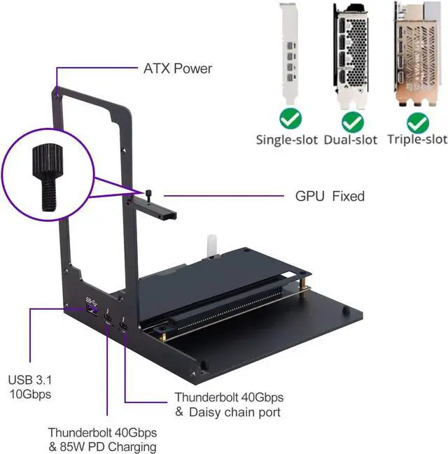 NOTE: Please make sure your laptop or your device has a Thunderbolt 4 or Thunderbolt 3 or USB 4 Port, otherwise it can not be used. And package does not contain the ATX power and does not contain the graphics card