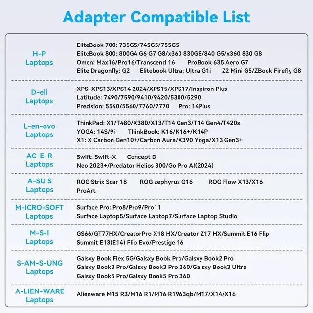 Please Check Compatibility: This KVM Docking Stations requires that your laptop's USB C port supports the DP Alt Mode feature, or a laptop with Thunderbolt 3/4/5 ports. For example, the following laptop series: H-P Laptops-EliteBook 700/800, Omen, Elite Dragonfly, Elitebook Ultra series; D-e-ll Laptops-XPS, Latitude, Precision, Pro series; Le-no-vo Laptops-ThinkPad, YOGA, ThinkBook, X1 series; A-c-er Laptops-Swift, Concept D, Neo 2023+ series; A-su-s Laptops-ROG, ProArt series. For laptop specific models or compatible models of other brands, please check the second main picture and the second picture of Product Description to confirm