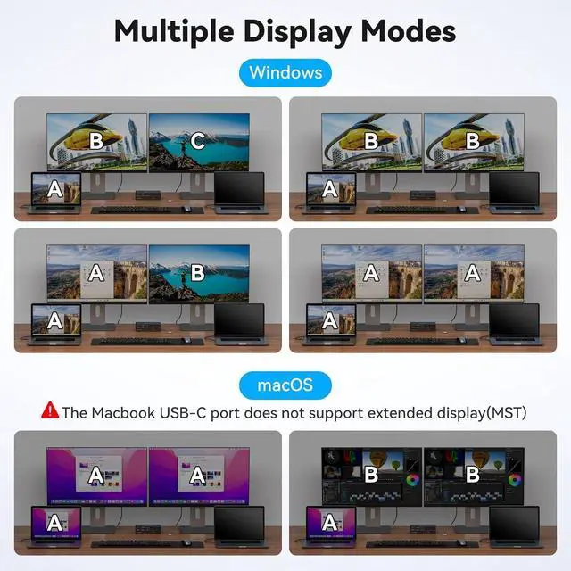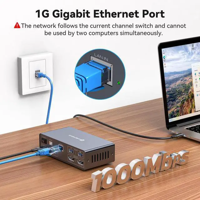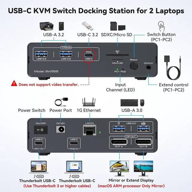 Before Purchase: 1.Your computer must have a Thunderbolt 3 (or higher) USB-C port. 2. When connecting a MacBook/Mac OS device to dual monitors via the switcher, only mirroring mode is supported, not extended display (a system limitation). 3.The switcher's USB-C port does not support charging (no PD function).4. Avoid DP cables over 9 feet, below DP1.4 spec, or any adapters. For stable performance, use a 3.3-foot DP1.4 cable