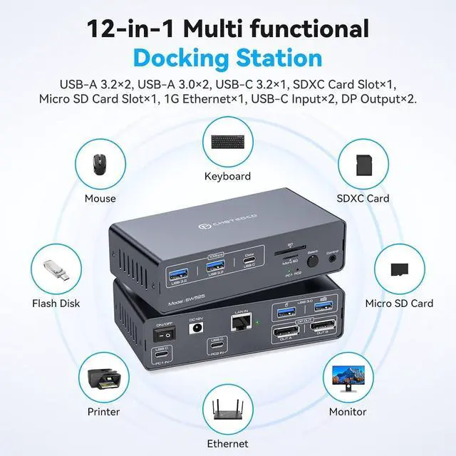 12-in-1 Docking Station: USBC display port KVM Switcher allows 2 PC share 2 4K@120Hz DP 1.4 ports (Windows supports extended display), 2 USB A 3.0 ports, 4 USB A/C 3.2 ports, 1G ethernet port, SD and microSD card slots, and moreexpanding connectivity while saving desk space. Note: Does not support laptop charging