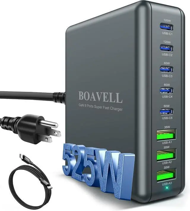 8-Port Fast Charging BlockCharge up to 8 devices simultaneously with this 525W usb c charger block, featuring 5 USB-C and 3 USB-A ports. Ideal for powering smartphones, tablets, laptops and more.