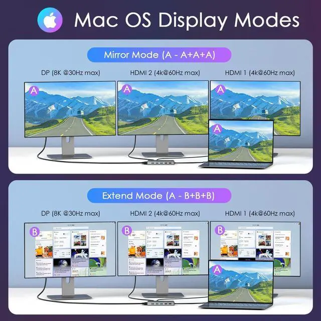 4K Dual Monitor&Triple Display: The docking Station dual monitor can easily to achieve dual-monitor and triple-monitor displays for Windows. Single use HDMI max up to 4K@60Hz,DP up to 8K@30Hz(DP1.4). When connect 2 displays, the resolution will be dual 4K@60Hz(DP1.4). Display output will be dual 4K@60Hz and 4K@30Hz when triple display(DP1.4). When connecting 3 monitors and only two monitors are displayed, please plug in the DP port first,then plug in the 2 HDMI ports. Mac OS ONLY Support Mirror Mode.