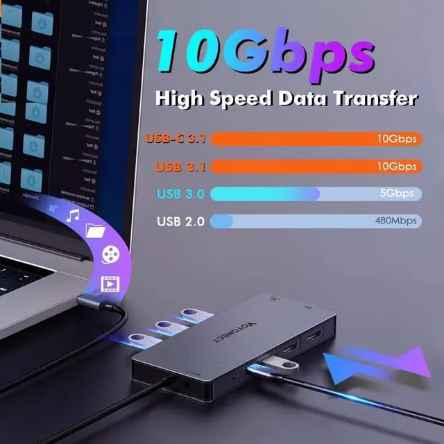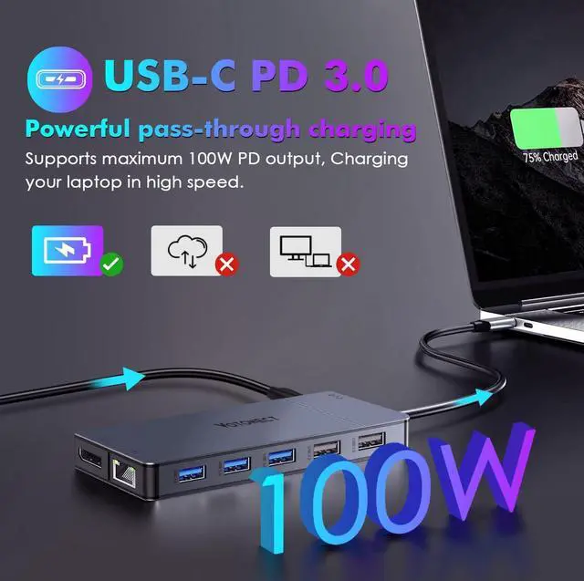 Fast Data Transfer & PD Charging Port: Equipped with USB-C 3.1, this docking station seamlessly combines high-speed data transfer and fast charging. Achieve data transfer speeds of up to 10 Gb/s while simultaneously delivering 100W PD charging power. Experience the perfect balance of performance and efficiency with this versatile docking solution. Note: The docking station requires 13W of power to operate, leaving 87W available for charging your laptop.