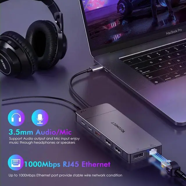 Gigabit Ethernet & Audio/Mic: The dual monitor docking station supports 10/100/1000BASE-T LAN networks. Simply plug in an Ethernet cable to enjoy ultra-fast gigabit Ethernet speeds and the reliability of a wired connection. Additionally, this Thunderbolt dock features a 3.5mm combo Mic/Audio (2-in-1) port, allowing you to connect your wired headset and enjoy your music without disturbing others.