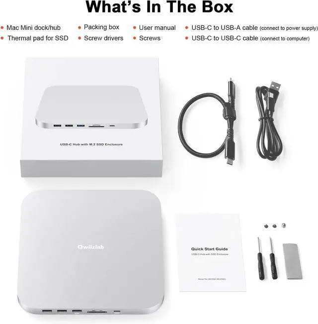 WHAT'S IN THE BOX - includes MC25M (Silver), quick start guide for users, USB-C to USB-C cable for connecting to computers, USB-C to USB-A cable for connecting external power when M.2 SSD installed.