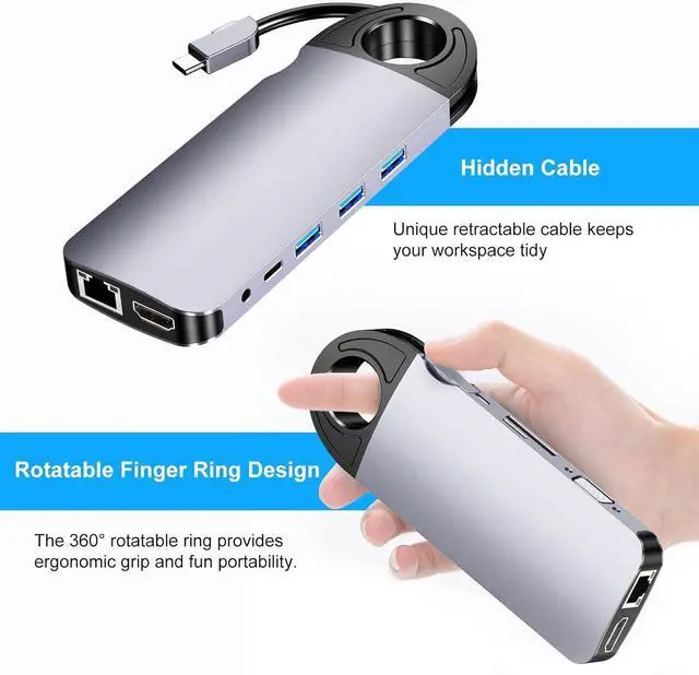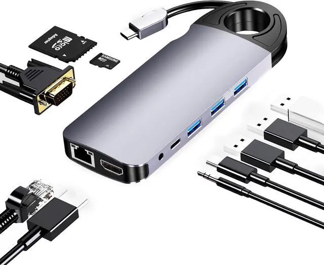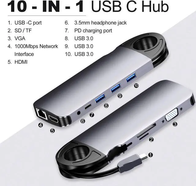 10-in-1 multifunctional design: integrated PD fast charging (60W), Gigabit network port, HDMI/VGA dual display output, 3×USB 3.0 (5Gbps), SD/TF card slot, 3.5mm audio port, solve the problem of insufficient notebook interfaces and meet the needs of office, entertainment, and creation in all scenarios