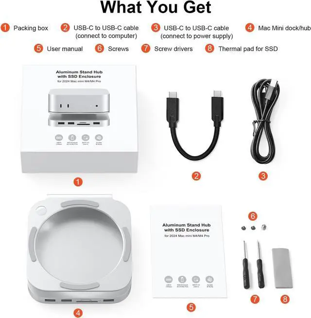 What You Get: It includes UH60 Pro, quick start guide for users, screws and screw driver for SSD installation, silicone thermal pads for SSD, USB-C to USB-C cable for connecting to Mac Mini, USB-C to USB-A cable for connecting to external power supply.