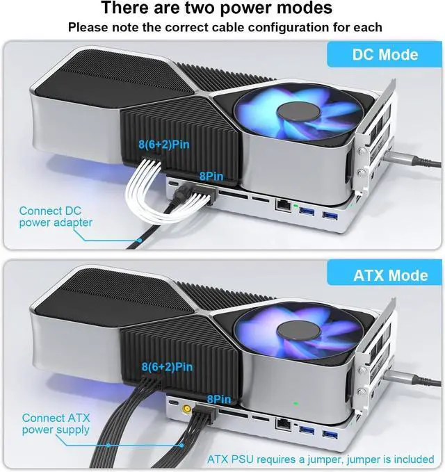 Flexible 4 power input options (ONLY need ONE): Type-C PD Power Input (20V 5A), DC7450 20V Power Input (19-20V, DC5525 20V Power Input (19-20V), CPU 8Pin ATX Power Supply. Please NOTE: The Max DC input power must not exceed 330W; DC and ATX power supplies have different wiring for the Graphics Cards.