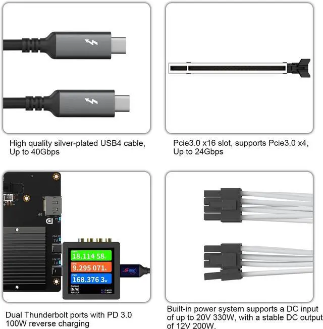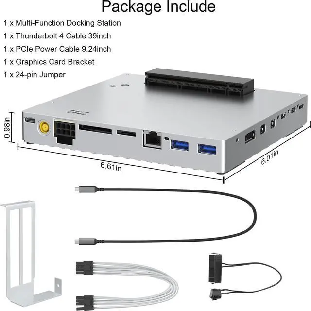 Packing Includes: A eGPU DOCK, High-quality Standard Thunderbolt 4 Cable (39inch), a white 8Pin GPU Cable, a 24Pin Power Jumper Cable