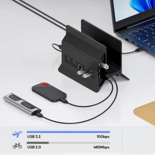Features Power Delivery pass-through allowing the laptop to charge while using multiple connected devices simultaneously
