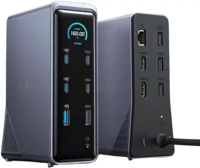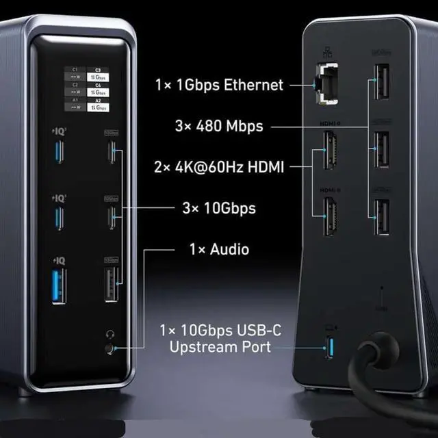 Equipped with 14 ports including USB, HDMI, Ethernet, and audio jack for broad device compatibility