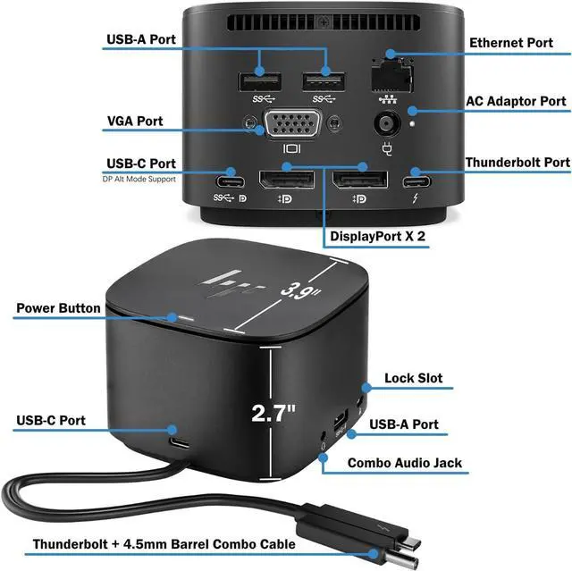 All-in-One HP Docking Station HP Laptop Docking Station expands your laptops power with one combo cable, delivering data transfer, video, audio, and charging through a single connection. The combo cable can splits into Thunderbolt Cable and 4.5mm Barrel, Supports standard HP notebooks such as HP EliteBook and HP ProBook, as well as high-power HP mobile workstations like the HP ZBook series.