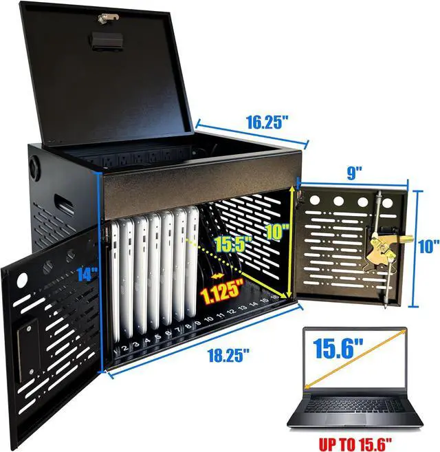 STORES & CHARGES 16 DEVICES: Safely charge and store up to 16 Chromebooks, tablets, or laptops (15.6" & 1" thick) in one compact charging station. Perfect for classrooms, offices, hospitals, and libraries, this metal charging cabinet keeps devices powered and organized.