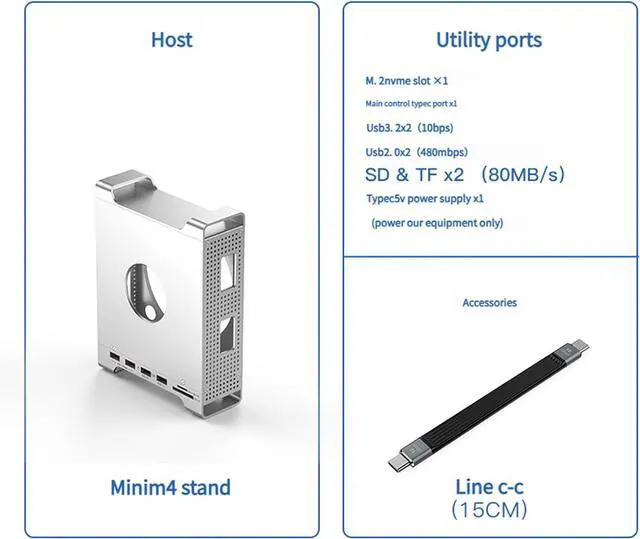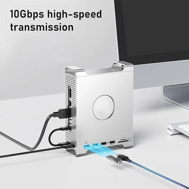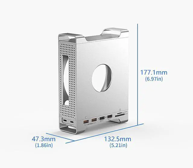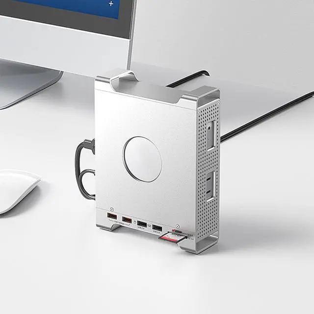 Vertically to save desktop space, and can also be used as a cooling base to optimized the ventilation of the device