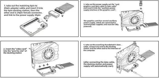 Wide Compatibility: The external GPU dock station fits for graphics cards (fit for RX series), PCIe X4 SSDs, PCIe sound cards, and PCIe network cards (10G). (Note: DMA cards are not supported.)