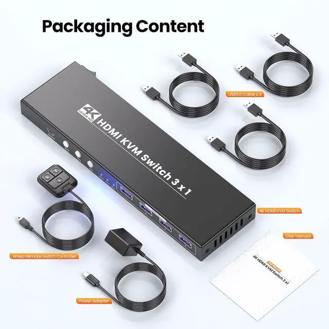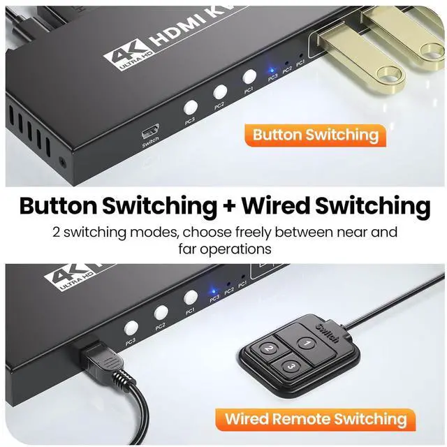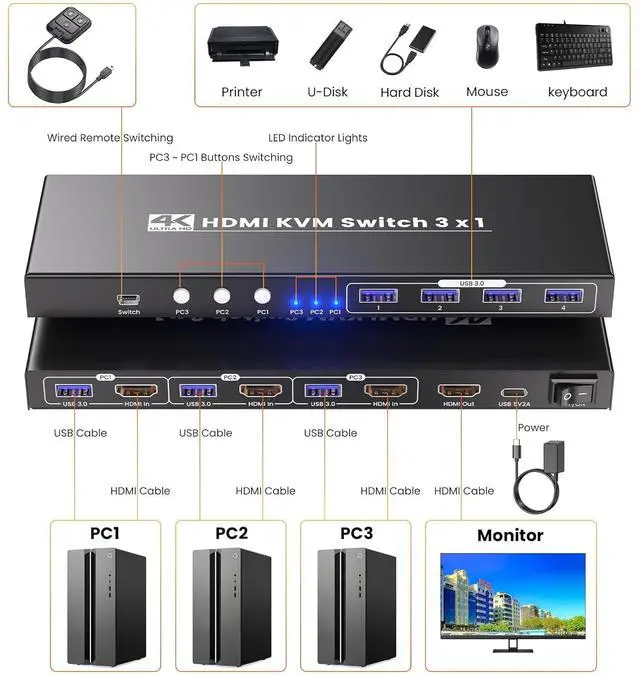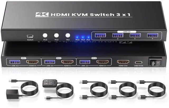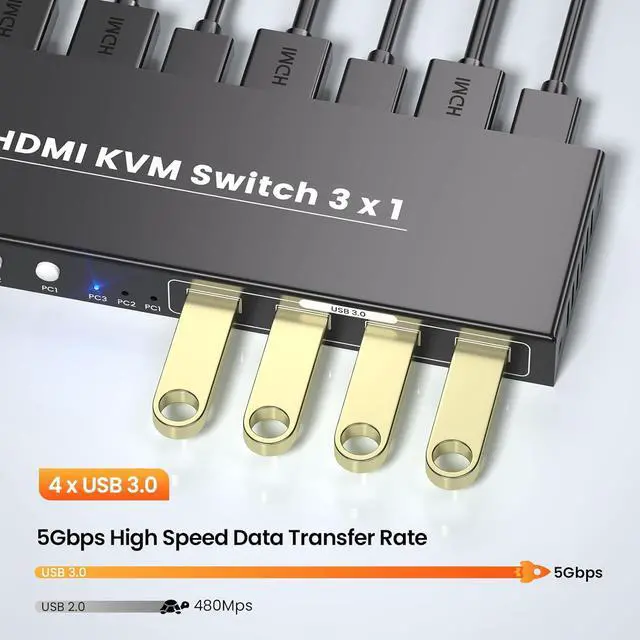 Managing multiple computers doesnt have to be messy or time-consumingmeet the 3-Port HDMI KVM Switch, the all-in-one solution that lets you control 3 devices with one monitor, keyboard, and mouse, while delivering exceptional visuals and connectivity.Equipped with a built-in USB 3.0 hub, this KVM switch takes data transfer to the next level. Boasting speeds up to 5Gbpsfar faster than USB 2.0it lets you transfer large files, back up data, or connect high-speed peripherals (SSDs, external hard drives, printers, gaming controllers) in seconds. Plus, its fully compatible with USB 2.0 devices, so you can keep using your existing gear without a hitch.