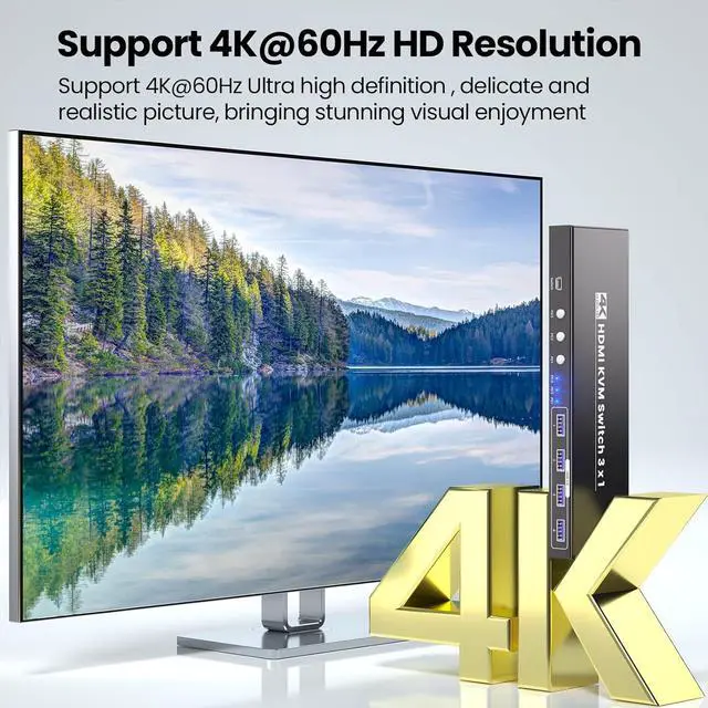 This3 Port HDMIKVM switch 1 Monitor 3 Computers stands out with its support for 4K@60Hz ultra-high definition, delivering crisp, fluid visuals that make every task shine. Whether youre editing 4K videos, designing detailed graphics, streaming movies, or gaming at high speeds, the KVM switch ensures vibrant colors, sharp details, and smooth motionideal for professionals and enthusiasts alike.