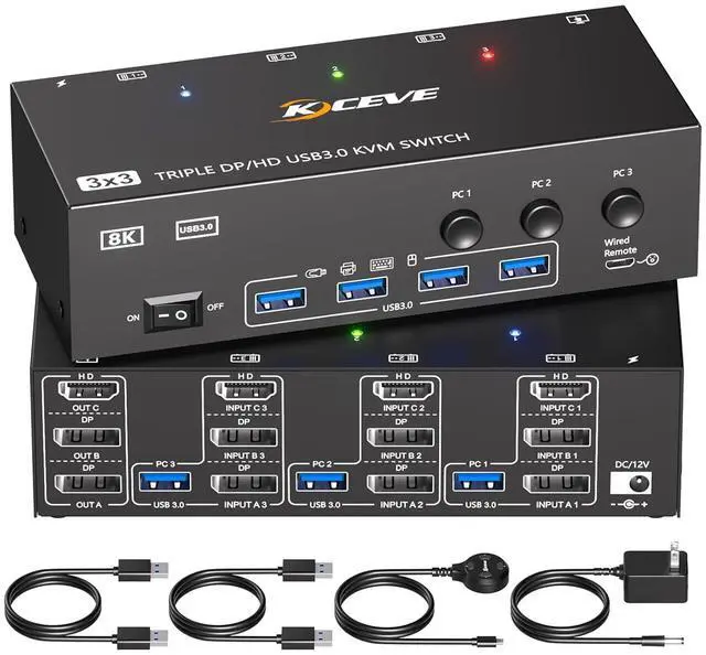 KVM Switch 3 Monitors 3 Computers2Displayport HDMI USB3.0 KVM Switches allows 3 computers to share 3 monitors and 4 USB3.0 devices,such as a mouse,keyboard,and printer.Ideal for users with 3 computers,quickly switch among the 3 PC with one set of keyboard and mouse,effectively saving costs,optimizing desk space,and improving work efficiency.