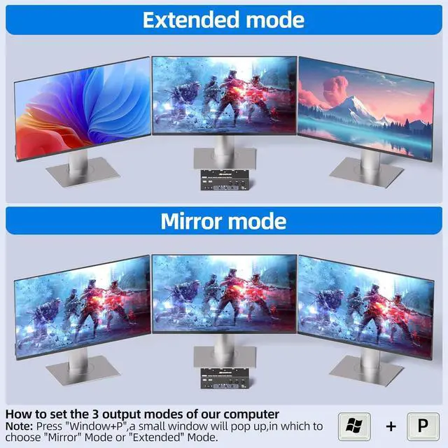 Supports Extended and Mirrored Display ModesExtended mode:extended mode can output three different screens,mirrored mode can output three identical screens.Note:each connected computer must support multi-screen display and have two DP ports and one HDMI port.Selection method: Press Window and P on the keyboard and mouse at the same time.